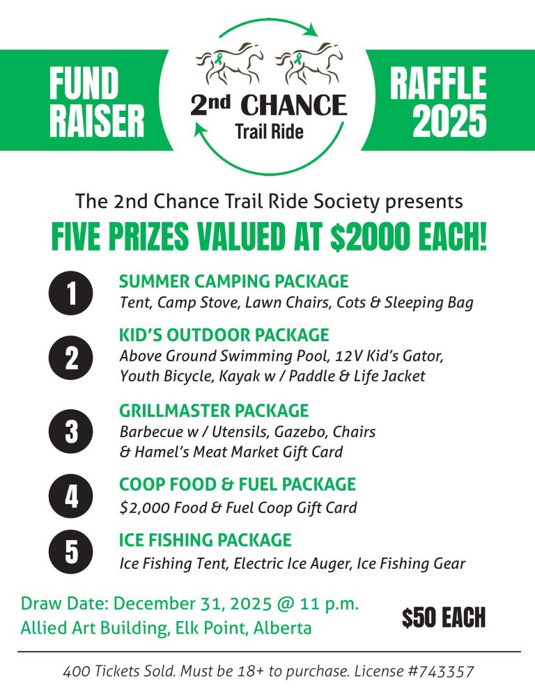 • FIVE BIG RAFFLE prize draws valued at $2,000 total each, raffle tickets can be purchased at Elk Point Realty, St. Paul Glass or by calling Denise 780 645 0402 or Len 780 812 9662